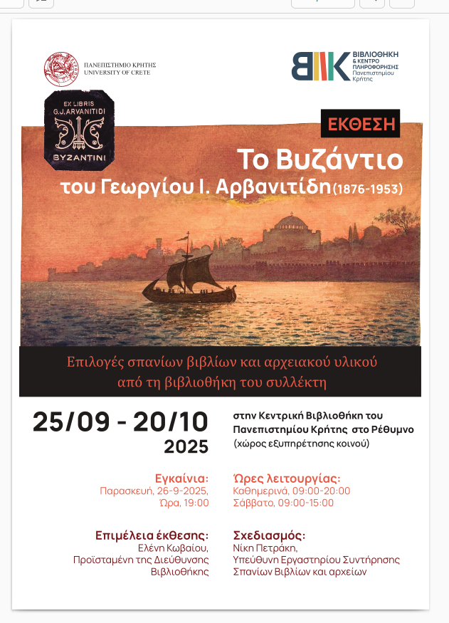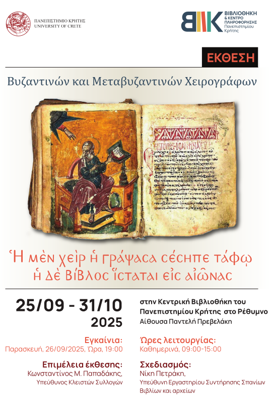 Η Βιβλιοθήκη του Πανεπιστημίου Κρήτης, επί τη ευκαιρία της 12ης Συνάντησης Ελλήνων Βυζαντινολόγων, πραγματοποίησε την Παρασκευή 26 Σεπτεμβρίου 2025, στις 19:00, στη Βιβλιοθήκη του Πανεπιστημίου Κρήτης στο Ρέθυμνο, τα εγκαίνια των εκθέσεων: