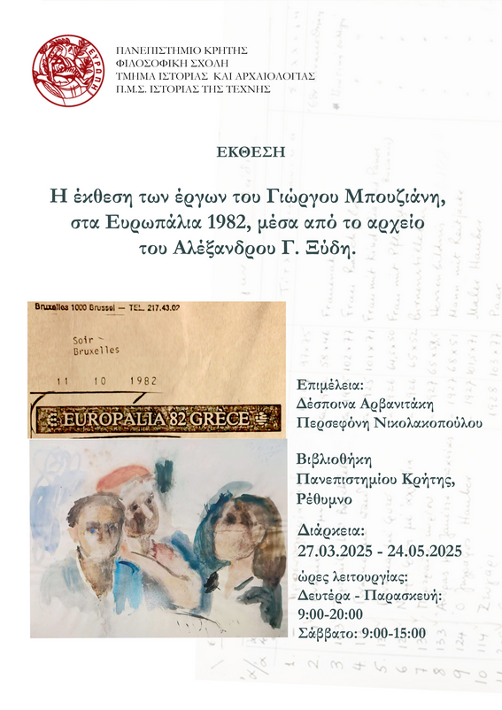 Στο πλαίσιο του Προγράμματος Μεταπτυχιακών Σπουδών στην Ιστορία της Τέχνης, του Τμήματος Ιστορίας και Αρχαιολογίας του Παν/μίου Κρήτης, φιλοξενείται στην Κεντρική Βιβλιοθήκη (στο Ρέθυμνο) έκθεση με τίτλο “H έκθεση των έργων του Γιώργου Μπουζιάνη στα Ευρωπάλια 1982, μέσα από το αρχείο του Αλέξανδρου Γ. Ξύδη”